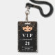 A modern, stylish and glamourous badge for a 21st (or any age) birthday party. A black background with dark faux gold glitter and a masquerade mask. With the text: VIP. Personalise and add name, age, address/date. The name is written with a modern hand lettered style script with swashes.