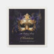 A simple, modern, elegant and chic 50th birthday party personalized napkin with a masquerade theme, featuring a gold masquerade mask with purple and gold accents, modern typography and a moody black and purple background, as well as elegant calligraphy. A lovely choice for a fiftieth birthday party in New Orleans, the Bayou or with a Mardi Gras, Nola theme, carnival, masquerade theme.