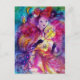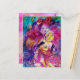 Colourful Venetian nocturne with an expressive ,romantic character : whimsical violin player with feathered sparkling pink fuchsia costumes and a funny owl in the moon light ,with a magic flowers in pink ,orange ,gold sparkles on the backside of the card. .Watercolor painting in bright red ,blue,purple ,yellow colours ,inspired from Piero (Pierrot ),Comedy of Art (Commedia dell'arte ) and Carnival of Venice .
