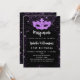 For an elegant Masquerade, 21st (or any age) birthday party. A classic black background. Decorated with purple faux glitter sparkles and a masquerade mask. Personalise and add a name, age and party details. The name is written with a hand lettered style script