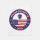 Badge of Massachusetts with flag of Massachusetts and flag of USA colours, rounded shape.