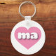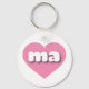 This keyring features a vibrant pink heart containing the bold, white, rounded, lower case letters ma, a playful abbreviation for the state of Massachusetts, the bay state.