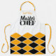 Geometric mosaic pavement style patterned print all over elegant apron in orange peach, white, and black with a bold MASTER CHEF typography script.+++++++++++ You can personalise it with your name. ++++++++ It can be a nice gift for a cooking lover or a master chef - husband, friend, fiancee, or employee.