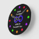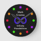 Math Clocks can be so cool and this math clock is no exception. The wall clock features the infinity math symbol in blue in the centre on a black background with the words "Math Creates Infinite Possibilities" around the infinity symbol. The different times are represented by different coloured circles (purple, red, orange and green) which are placed around the clock. This math clock is perfect for the math classroom or wherever those who have a love for math gather. Copyright Kathy Henis