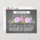 Ask your matron of honour with a beautiful card that says "I can't say 'I do' without you." This bridesmaid card features lovely watercolored flowers and a mix of modern typography, all on a trendy chalkboard background. Make it easy for them to say yes with this beautiful and stylish card. Available in maid of honour, matron of honour, junior bridesmaid, and flower girl versions. Say thank you with a matching thank you card.