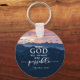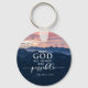 Inspirational quote scripture keychain depicts a nature photograph with a beautiful pink and blue mountain sunset. It features Bible Verse Matthew 19:26, "With God all things are possible."
