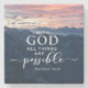 Inspirational quote scripture stone coaster depicts a nature photograph with a beautiful pink and blue mountain sunset. It features an encouraging Bible Verse Matthew 19:26, "With God all things are possible." *