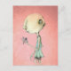 Illustration of a cute girl Maud, holding Her dragonfly with delicate Fingers. She has Bald Head and expressive eyes. She looks like an Alien with her dragonfly buddy. On a ''pink grapefruit'' coloured background and ''flower silhouettes'' this illustration of a girl and her Dragonfly will enchant anyone.