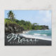 Postcard with a volcanic black sand beach in Waianapanapa State Park along the famous Road to Hana on the tropical island of Maui, Hawaii, USA with a black border and the text: 'Maui, Road to Hana'.