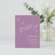 Elegant Mauve QR Code All In One Modern Script Simple Minimalist Wedding Invitation Postcard. Celebrate your special day with this elegant and beautiful wedding invitation card to beautify your special occasion. All the texts are pre-arranged for you to personalise easily and quickly with your own details. If you need further customisation or matching items, please email alldaybreakfastzazzle@gmail.com – we would love to help.