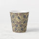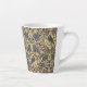 This latte mug features crows, dragonflies, and beetles surrounded by flowers and leaves in shades of mauve and grey on a tan background.