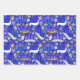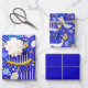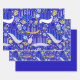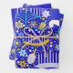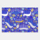 Colourful dreidels, menorahs, and stars on a rich blue background. One sheet each of large and small print, and one sheet of solid blue.