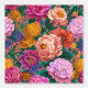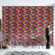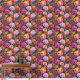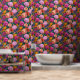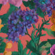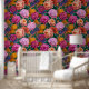 This bold floral pattern features dramatic purple, peach, and mustard yellow flowers on a dark pink background.
