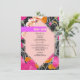 Light pink 6 sided geometric shape over pink orange and peach modern floral with dark marbleised design. Pink "menu" text over bright purple bar with black text underneath.