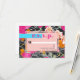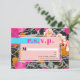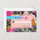 Light pink rectangle shape over pink orange and peach modern floral with dark marbleised design. Hot pink "r.s.v.p." text over bright blue bar with black text underneath.