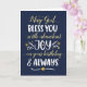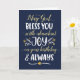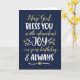 Wish someone a happy birthday with this unique calligraphy and hand-lettering style card, featuring the message, "May God Bless You with abundant Joy on your Birthday & Always." Includes heart, flower, and type accents with dark blue background.