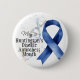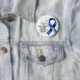 At the centre of the button, a bold blue awareness ribbon symbolises strength, resilience, and the fight for better treatments and understanding of HD. Behind the ribbon, a subtle DNA strand illustration represents the genetic nature of the disease and the ongoing research to find a cure.