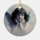 A comforting blessing on the back reads: may the angels watch over you. Beautiful vintage design of a sweet angel with soft white wings and rosy cheeks, holding her face in her hands. Looking peaceful and kind. The background is filled with soft ethereal clouds.