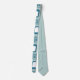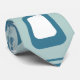 This necktie has a mid-century modern design of alternate rectangular mazes and rounded trapezoids in shades of teal.