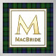Green tartan plaid foil print, with a gold foil framed in text area, against the Scottish clan MacBride tartan pattern background.  A large single letter monogram and gold foil name are ready to personalise.