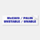 McCAIN / PALIN UNSTABLE / UNABLE Bumper Sticker