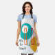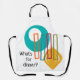 This apron has a mid-century modern design with a turquoise circle with a hole in it, four rectangles, orange, teal, beet, and green, and a gold pointy circle. If you like the design but prefer different colours, message me.