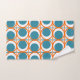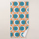 This towel set has a mid-century modern design of open orange circles with solid teal circles running across the pattern with teal vertical lines and orange horizontal lines.