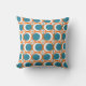 This throw pillow has a mid-century modern design of open orange circles with solid teal circles running across the pattern with teal vertical lines and orange horizontal lines.