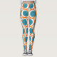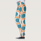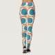 This leggings has a mid-century modern design of open orange circles with solid teal circles running across the pattern with teal vertical lines and orange horizontal lines.