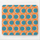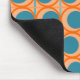 This mouse pad has a mid-century modern design of open orange circles with solid teal circles running across the pattern with teal vertical lines and orange horizontal lines.