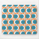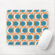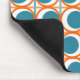 This mouse pad has a mid-century modern design of open orange circles with solid teal circles running across the pattern with teal vertical lines and orange horizontal lines.