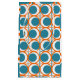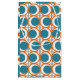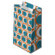 This gift bag has a mid-century modern design of open orange circles with solid teal circles running across the pattern with teal vertical lines and orange horizontal lines.