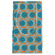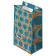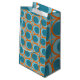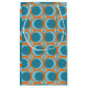 This gift bag has a mid-century modern design of open orange circles with solid teal circles running across the pattern with teal vertical lines and orange horizontal lines on a field of teal.
