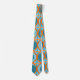 This tie has a mid-century modern design of open orange circles with solid teal circles running across the pattern with teal vertical lines and orange horizontal lines on a field of teal.