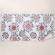 This beach towel has a mid-century modern design of flowers made of circles in shades of pink, cranberry and beige and black lines.