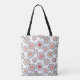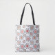 This tote bag has a mid-century modern design of flowers made of circles in shades of pink, cranberry and beige and black lines.