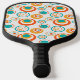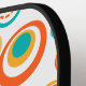 This pickleball paddle has a mid-century modern design of concentric circles in gold, orange, and turquoise on a white background.