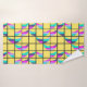 This towel set has a pink washcloth, a seafoam hand towel, and a bath towel with a mid-century modern design of crescent moons divided horizontally into three colours, pink, blue, lavender, or seafoam, split in half and scattered on a grid with a yellow background. If you like the design but want different colours, message me.