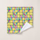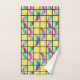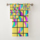 This towel set has a mid-century modern design of crescent moons divided horizontally into three colours, pink, blue, lavender, or seafoam, split in half and scattered on a grid with a yellow background. If you like the design but want different colours, message me.
