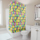 This shower curtain has a mid-century modern design of crescent moons divided horizontally into three colours, pink, blue, lavender, or seafoam, split in half and scattered on a grid with a yellow background. If you like the design but want different colours, message me.
