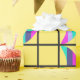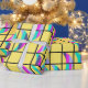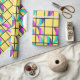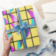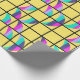 This wrapping paper has a mid-century modern design of crescent moons divided horizontally into three colours, pink, blue, lavender, or seafoam, split on half and scattered on a grid with a yellow background. If you like the design but want different colours, message me.