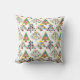 This throw pillow has a mid-century modern design of Christmas trees in different styles. One has a grid with rectangles with starbursts inside. Another has rounded rectangles with smaller rectangles inside. A third has curved lines with stars on them. The final tree is a triangle with other smaller triangles inside