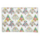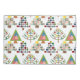 This pillowcase has a mid-century modern design of Christmas trees in different styles. One has a grid with rectangles with starbursts inside. Another has rounded rectangles with smaller rectangles inside. A third has curved lines with stars on them. The final tree is a triangle with other smaller triangles inside
