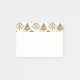 This notepad has a mid-century modern design of Christmas trees in different styles. One has a grid with rectangles with starbursts inside. Another has rounded rectangles with smaller rectangles inside. A third has curved lines with stars on them. The final tree is a triangle with other smaller triangles inside
