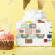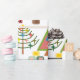 This wrapping paper has a mid-century modern design of Christmas trees in different styles. One has a grid with rectangles with starbursts inside. Another has rounded rectangles with smaller rectangles inside. A third has curved lines with stars on them. The final tree is a triangle with other smaller triangles inside.