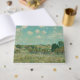 The meadow, where herbs grow, is enamelled in flowers, daisies, poppies, blueberries. Two little girls in blue aprons and straw hats with red and blue ribbons gather there. To the right, a wooden fence, behind which a few clumps of trees raise their blonde foliage. And further away, countryside as far as the horizon, whose crops climb the flanks of the hills, under a blue sky, edged with white clouds.