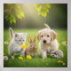 A high-quality graphic of a fluffy kitten, a playful puppy, a small bunny, and a tiny hedgehog playing together in a grassy field, under soft, natural lighting. This design is perfect for a wide range of products for animal lovers.