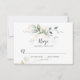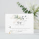 Elegant watercolor green and gold meadow botanicals including grasses, eucalyptus, and wild herbs minimalist design RSVP invitations. Subtle shades of green with gold accent botanicals surround your wedding details using a mix of calligraphy and modern fonts. The back of the card is a soft green watercolor wash with gold splash accents.
