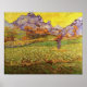 Meadow in the Mountains: Le Mas de Saint-Paul by Vincent van Gogh is a vintage fine art post impressionism landscape nature painting. A lone tree is growing in a field and a farm is in the distance with mountains in the background. A sunny summer day.