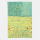 A yellow and green landscape art painting in green and yellow of a meadow or field full of wild flowers with a pine forest on the horizon. Original art by Nic Squirrell.